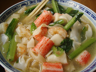 Kuah: 1 sudu kecil (atau lebih) bawang putih, tumis dalam minyak sikitttt jerr..pastu masukkan minyak bijan sket, tumis sampai wangi. Masukkan air utk kuah, agak2 lerr..kalau nak kuah banyak, letak banyak air. Masukkan udang & seafood hightlight/crab stick. Masak sampai mendidih/udang tu masak. Masukkan sawi. Rasa garam. Kacau2 and tutup api.